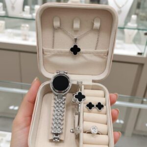 Pearl & Stone Luxury Women’s Jewelry Watch Set – 5-Piece Silver Edition with Bracelet & Rings