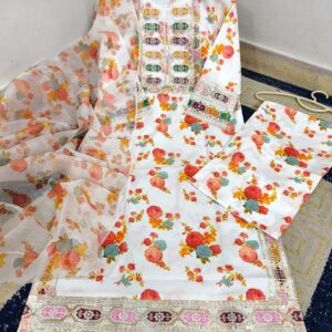 Block Printed 3-Piece Hand-Work Suit – Cotton Shirt with Crinkle Chiffon Dupatta