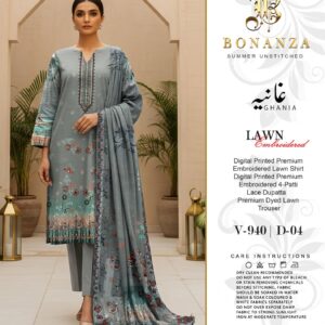 Bonanza Ghania Summer Unstitched – Premium Embroidered Lawn with 4-Patti Lace Dupatta